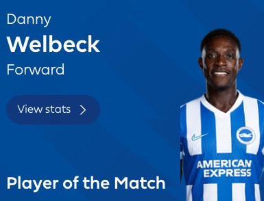 英超第31轮,布莱顿主场2-1击败利物浦,此役上演梅开二度的布莱顿前锋维尔贝克当选全场最佳球员。
