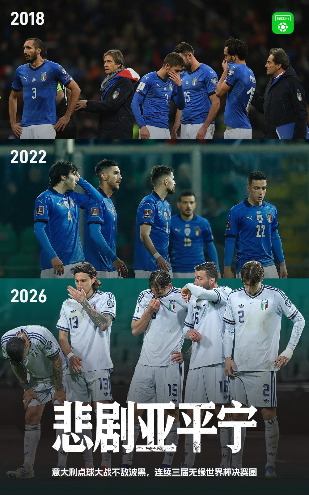 意大利上一次晋级世界杯淘汰赛是在2006年,那年都灵举办了冬奥会,蓝衣军团捧起了大力神杯。2026年,冬奥会再次回到亚平宁,意大利代表团收获10金6银14铜,意大利足球却仍然走在黑暗当中。