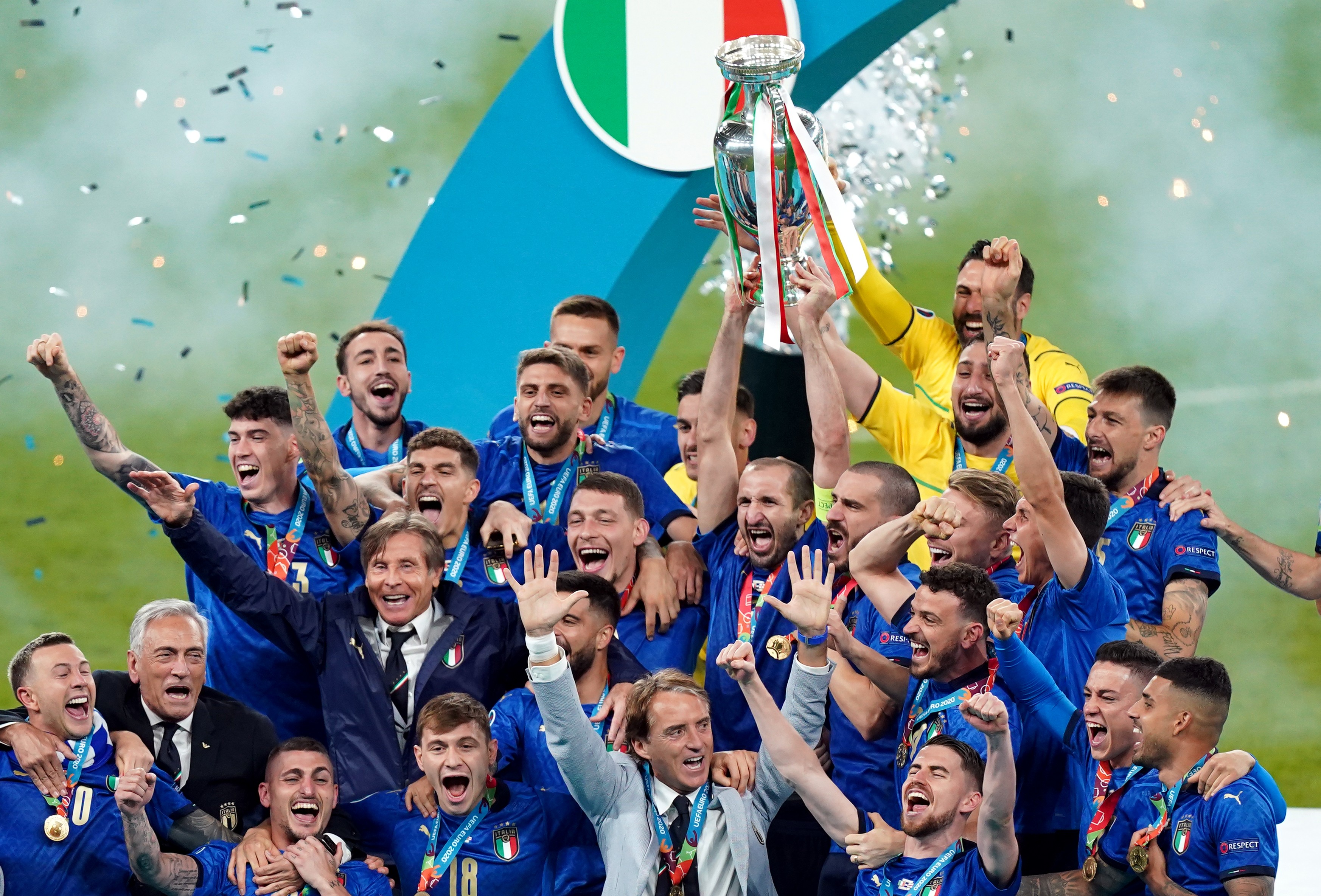 决赛在温布利对战英格兰,球队在早早丢球的情况下依靠博努奇的进球将比赛拖入加时,点球大战中多纳鲁马两献神扑,意大利3-2获胜,第二次获得欧洲杯冠军。决赛哨响后,球员们疯狂庆祝。曼奇尼失控落泪,他后来表示:“这是看到球员和球迷庆祝后涌现的情感……我们三年的努力终于结出果实。”